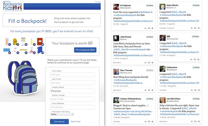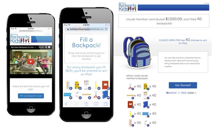 Backpacks for Kids is an annual fundraising drive put on by Bell Aliant, to raise money for school supplies for children who can't afford the basics. This year, Bell Aliant wanted to open up this campaign to the general public, and needed a fun way to solicit contributions. We built a website where visitors could fill a digital backpack with virtual school supplies, make a contribution with their credit card, and promote their contribution to their social networks, from any device.