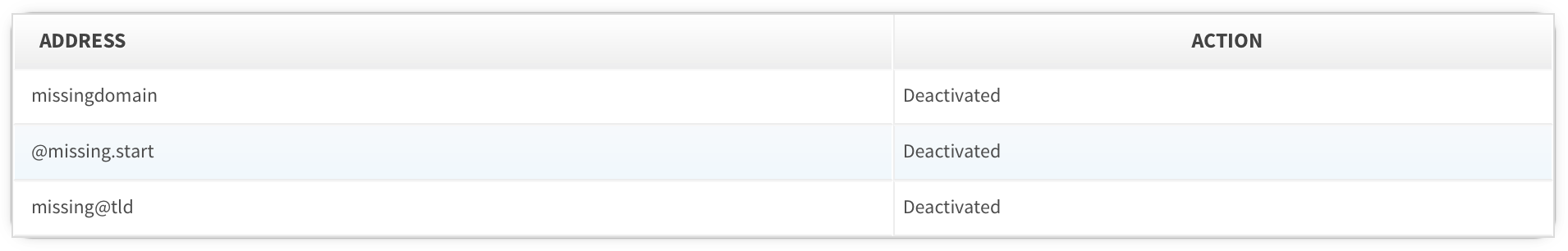 LassoMailer will automatically identify all addresses that match specific patterns (or lack of pattern) and will deactivate all ocurrences and display them.