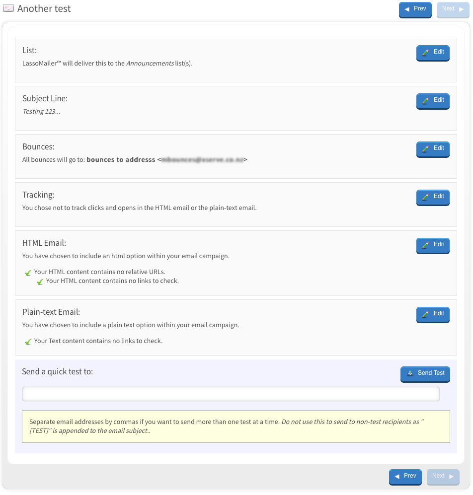 The checklist window provides an overview of all the parts of your campaign. It will indicate if something is missing or formatted incorrectly, so you can go back in and edit if need be. If anything is missing, LassoMailer will call attention to it on this checklist so that you can fix it. Just click on the edit button beside the problem section of the campaign to make edits.